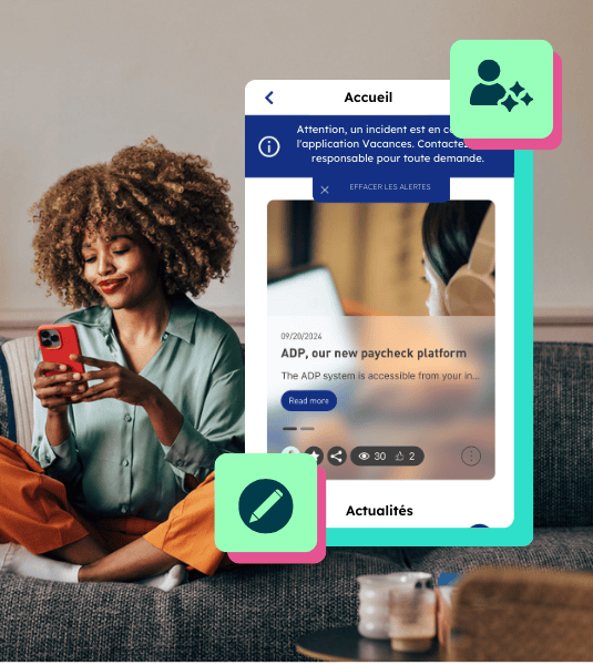 Offrez à vos collaborateurs une expérience mobile de premier ordre. Connectez chacun de vos collaborateurs avec vos actualités, connaissances et communications en temps réel, à tout moment et selon leurs préférences, renforçant ainsi l'engagement de vos équipes.