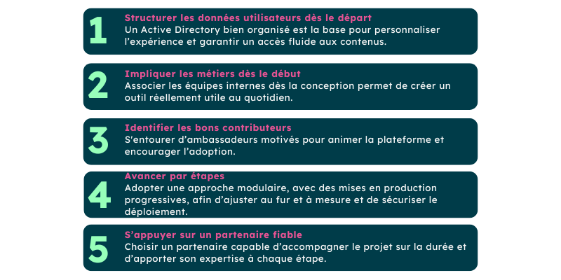 • Structurer davantage les profils utilisateurs via Active Directory pour proposer des contenus adaptés à chaque filiale et fonction.