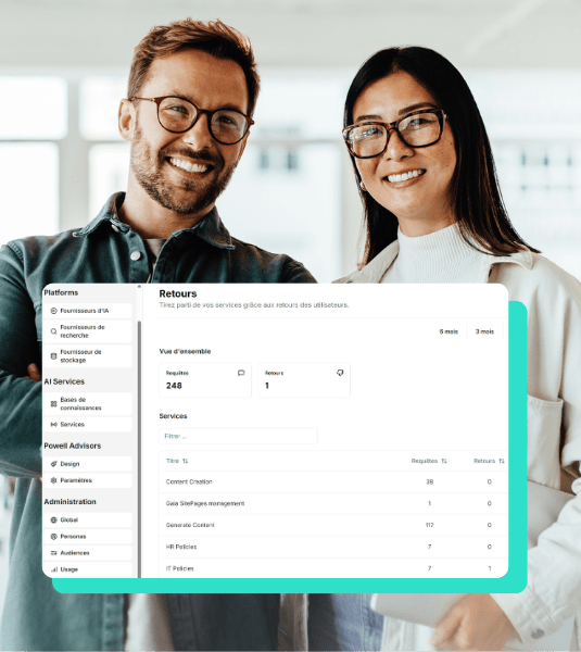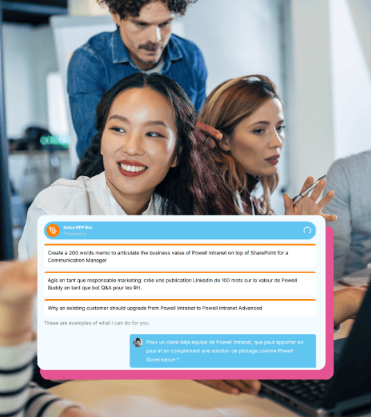 Mettez vos bases de connaissances au cœur de vos processus métiers grâce à des chatbots thématiques intégrés dans vos librairies SharePoint. De véritables experts internes qui, grâce à l’intelligence artificielle de « Powell Buddy for department », permettent d’extraire facilement des informations clés et de les exploiter de manière optimale. Et tout cela, en posant une simple question.