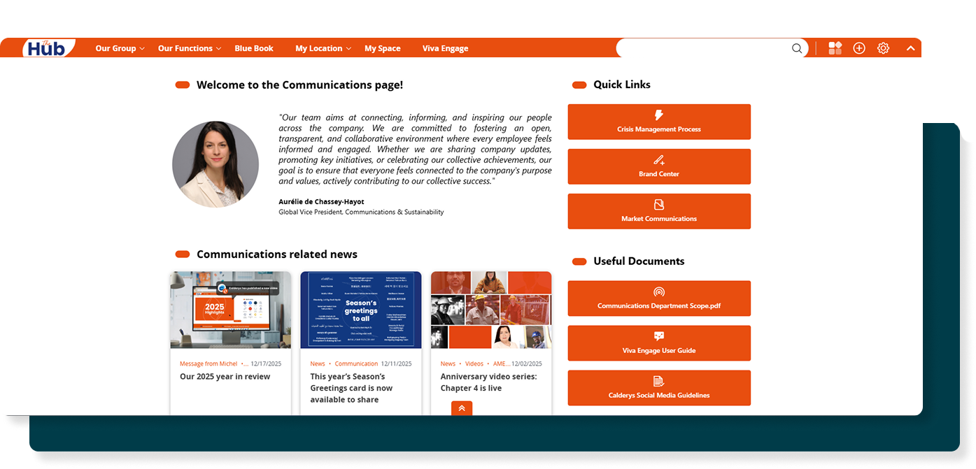 More importantly, it supported both a technical migration and a cultural transformation. Launched under tight timelines and during a full collaboration tool migration, The Hub became the anchor of the new Calderys identity. It strengthened belonging, broke down silos between legacy organizations, and created a shared digital space for the future. And it’s built to evolve. Its adaptability ensures Calderys can scale, respond to change, and support future initiatives with confidence.